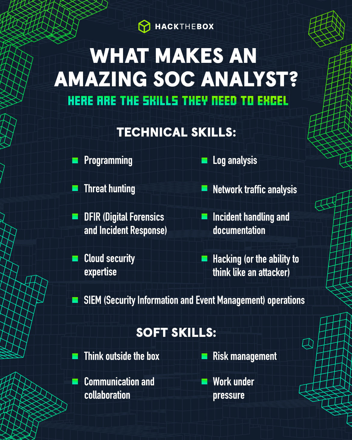 The technical foundations need to be built before embarking on a career as an analyst. These skills will set you up for success and allow you to effectively safeguard IT infrastructure. Many of these can be learned through hands-on upskilling when following our SOC analyst job-role path.