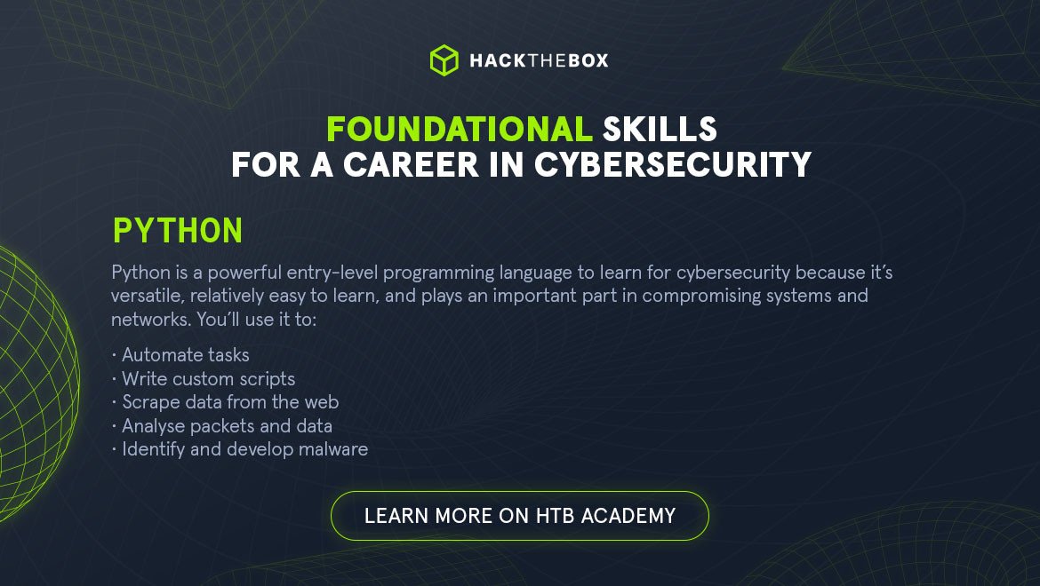 Python is a powerful entry-level programming language to learn for cybersecurity because it’s versatile, relatively easy to learn, and plays a key part in compromising systems and networks. You’ll use it to: