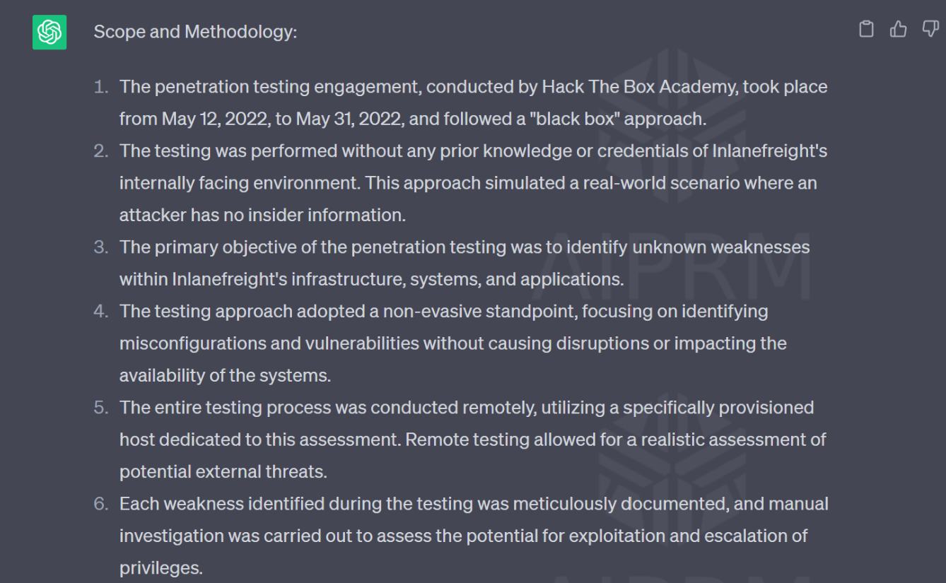 When we use the prompt: "Take the following list of notes from a penetration testing engagement and create a section of a penetration test report entitled ‘Scope and Methodology", ChatGPT will fill in additional details to give more context and explanations.