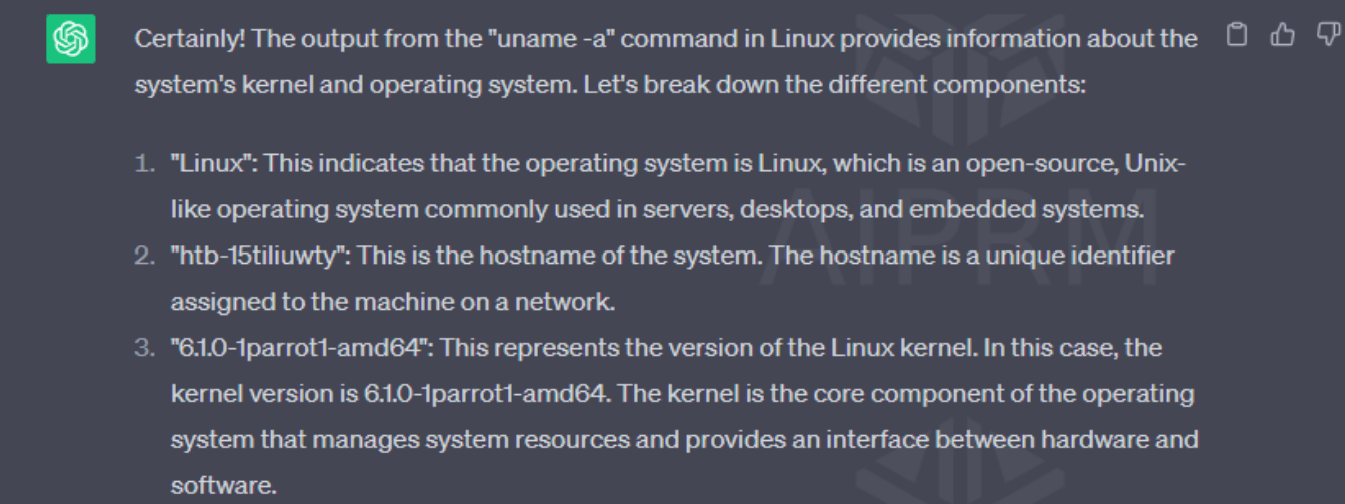 You could run the command “man uname” to get the manual page and get more information on the command, but it is not that informative. Instead, we can ask ChatGPT to explain the command and interpret the output for us: