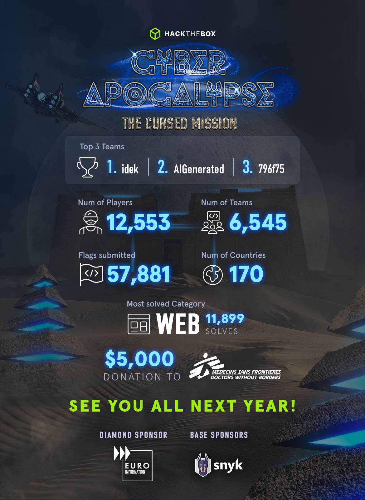 We will be back for Cyber Apocalypse 2024 next year, but until then, keep an eye out for other events on our CTF platform and join our Discord server to be a part of this fantastic community. If you didn’t participate and are feeling left out, no worries! All challenges will be uploaded to our main platform. Some challenges may have their write-ups uploaded on our blog and YouTube channel, so stay tuned!