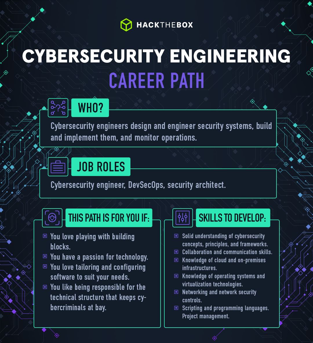 Engineers are responsible for designing and implementing security solutions—the infrastructure to defend from cyber attacks. |
