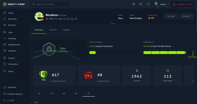 Here’s an example of the skills metrics you can view from any user profile in Hack The Box’s app.