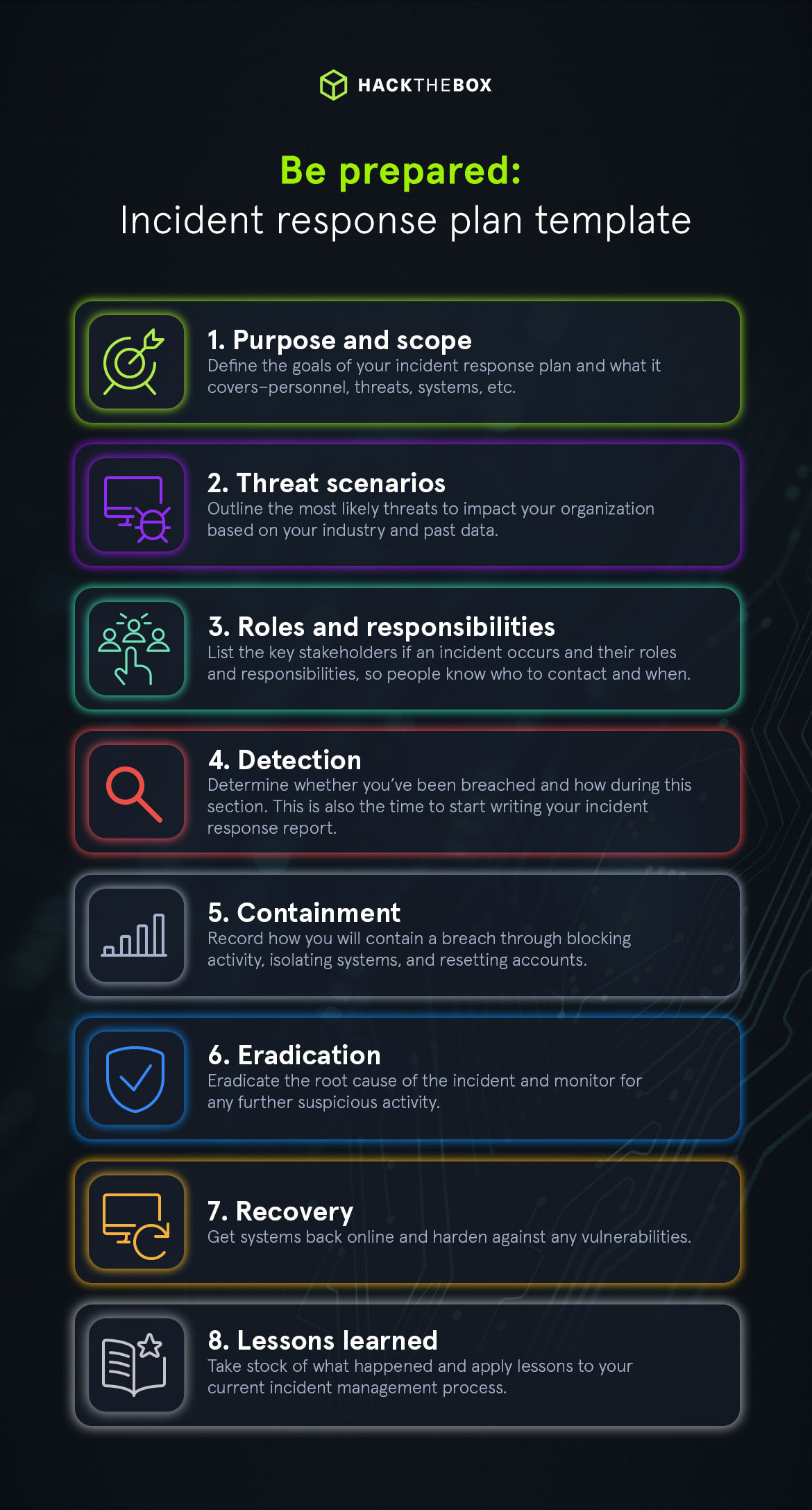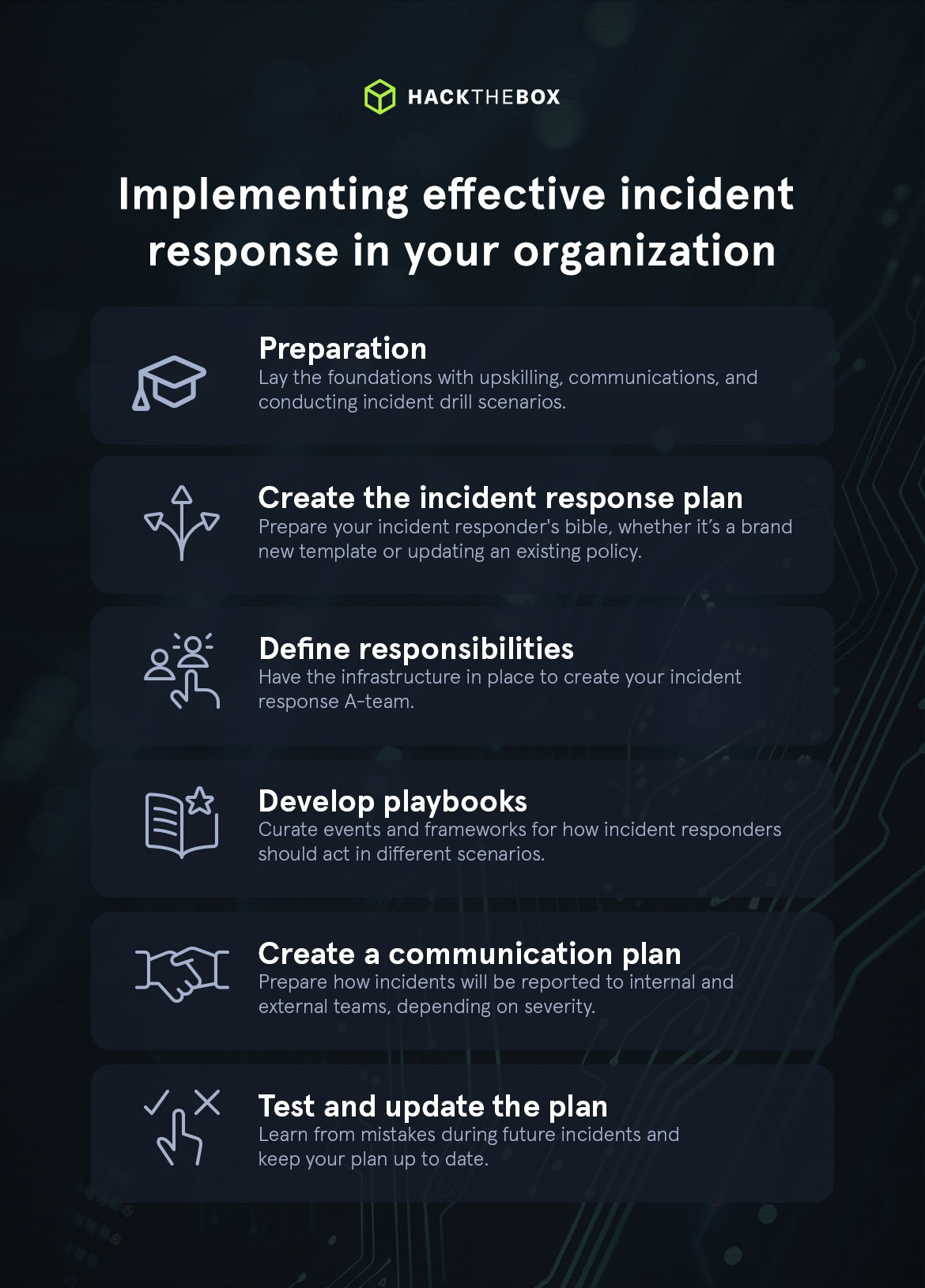 Implementing, testing, and tweaking your incident response plan is essential for all blue teams. Incidents and breaches will always happen, so having a plan in place is vital to minimize the impact on business operations.