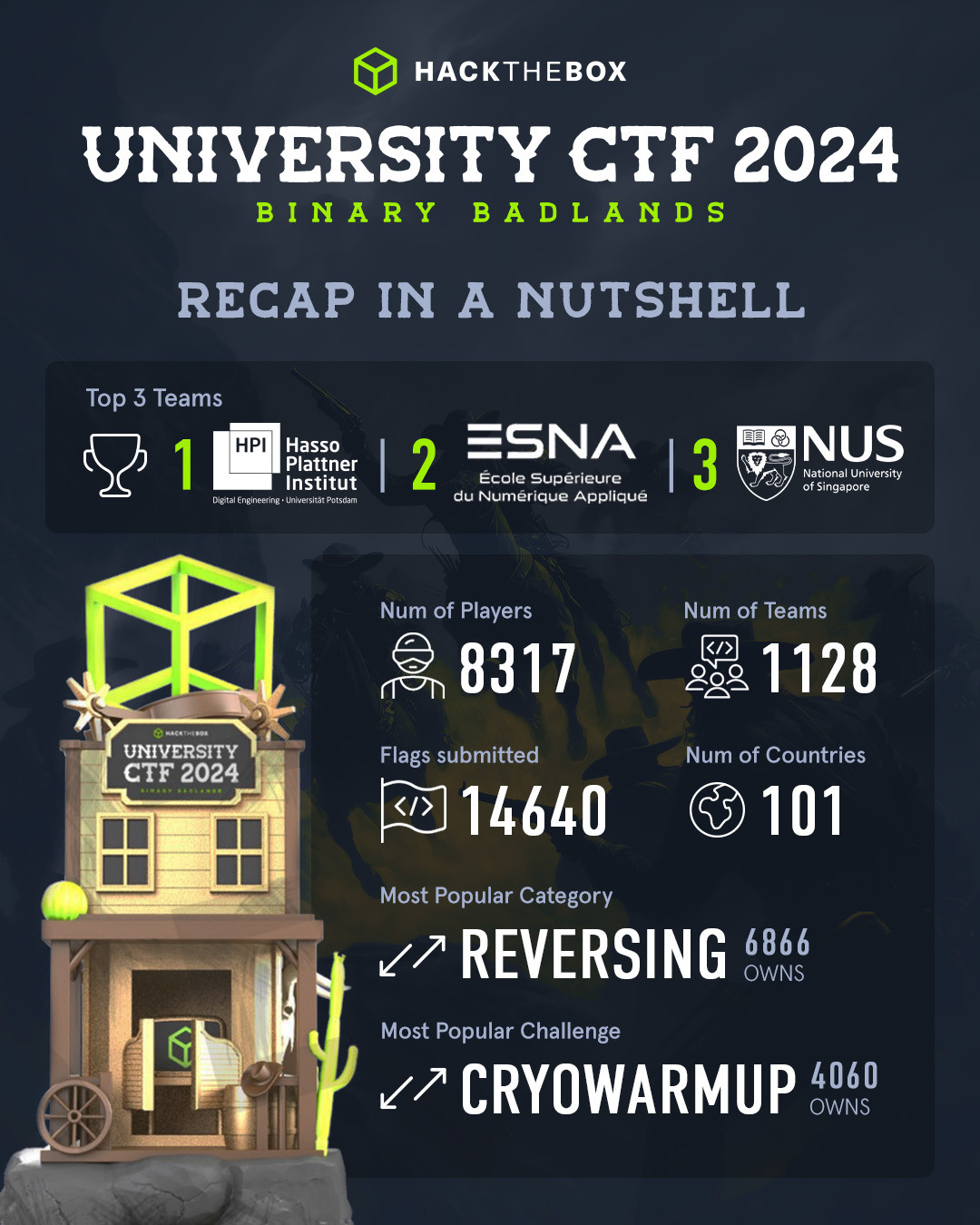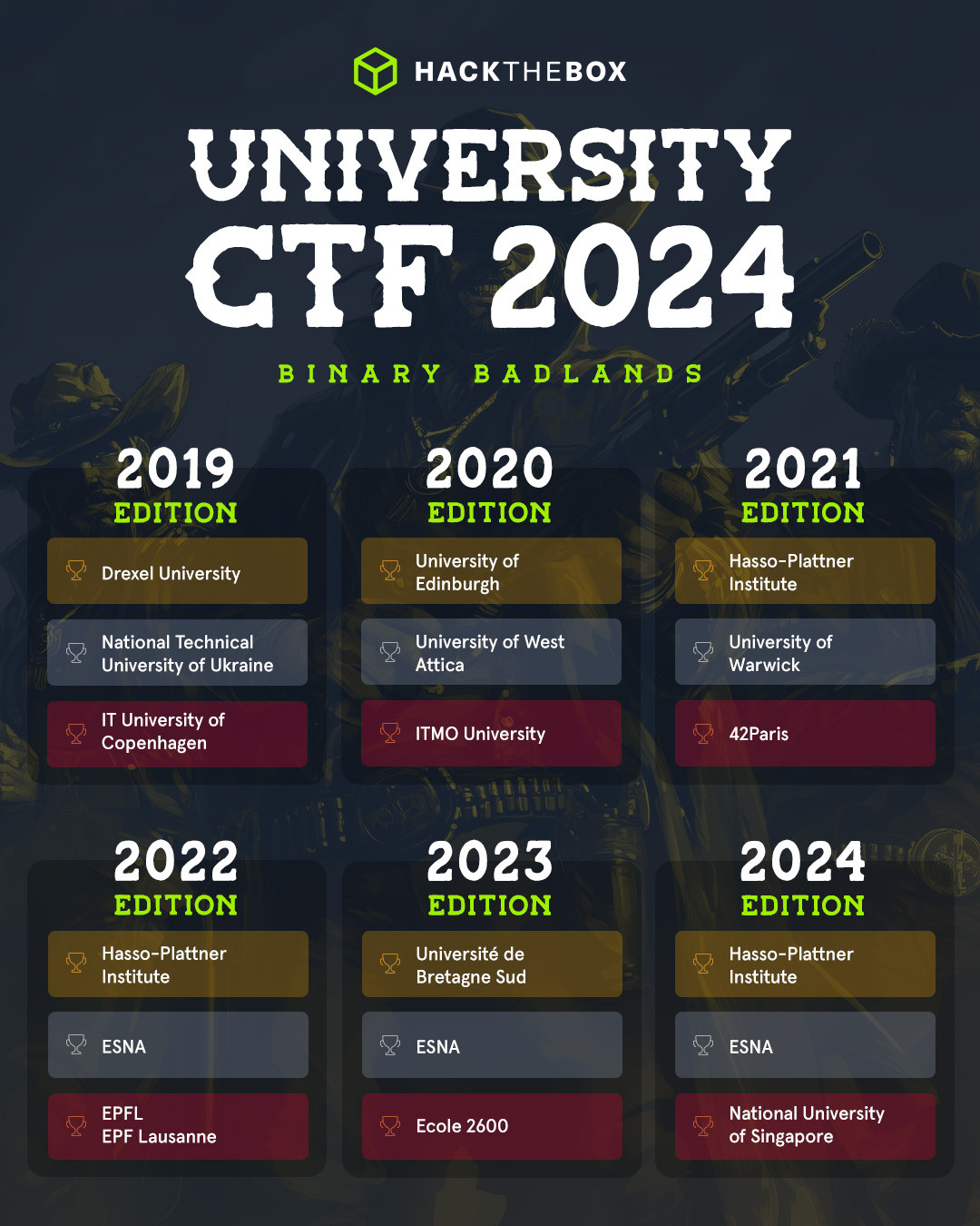 The Hack The Box (HTB) University CTF is an annual Capture The Flag (CTF) event where university and college students compete against each other for fame, prizes, or just for fun.