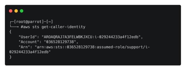 Issuing the following command (effectively whoami for AWS) verifies that our current role is support.