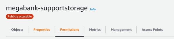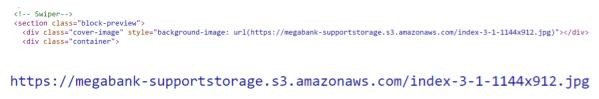 Inspection of the website source code reveals that website images are being stored in an Amazon S3 bucket named megabank-supportstorage.