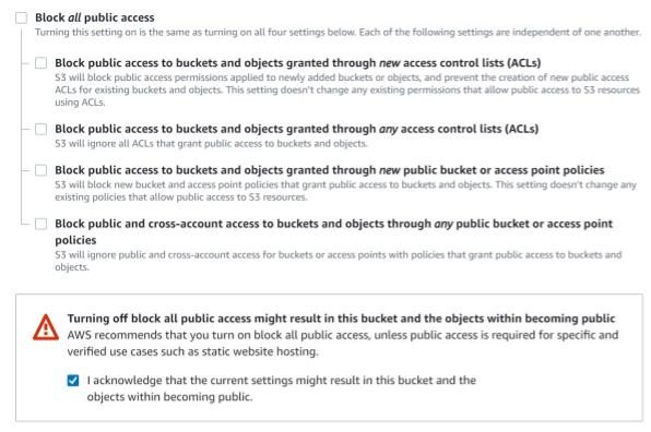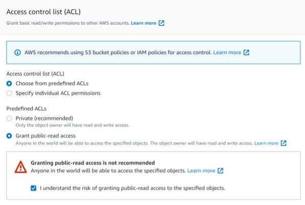 A further warning was displayed when configuring files uploaded to the bucket to be world-readable.