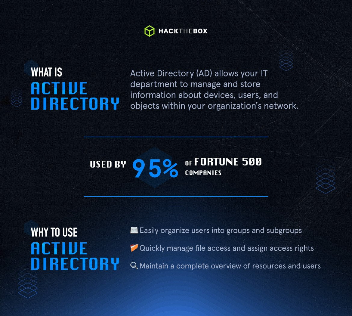 Active Directory (AD) is a directory service for Windows network environments used by an estimated 95% of all Fortune 500 companies. Its structure facilitates centralized management of an organization's resources which may include users, computers, groups, network devices, file shares, group policies, devices, and trusts.