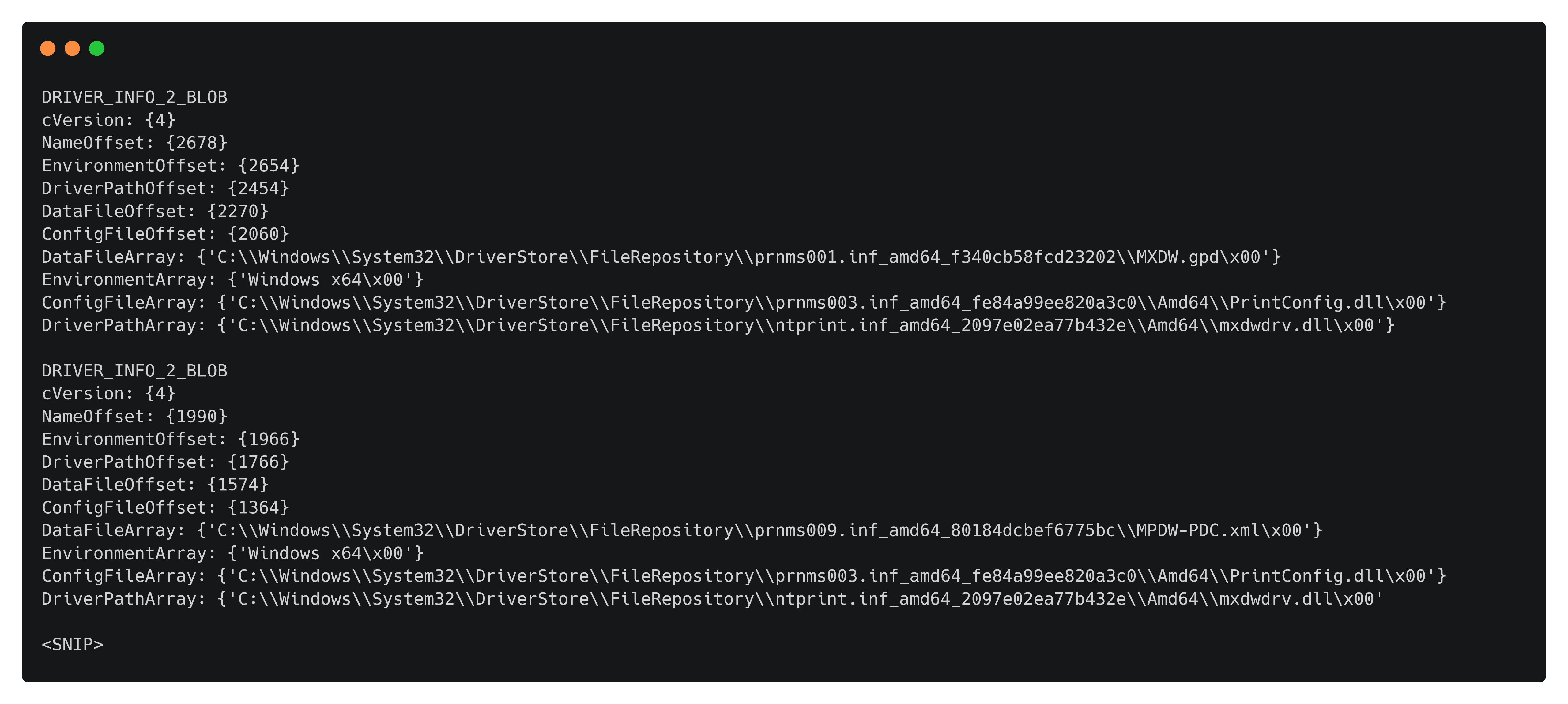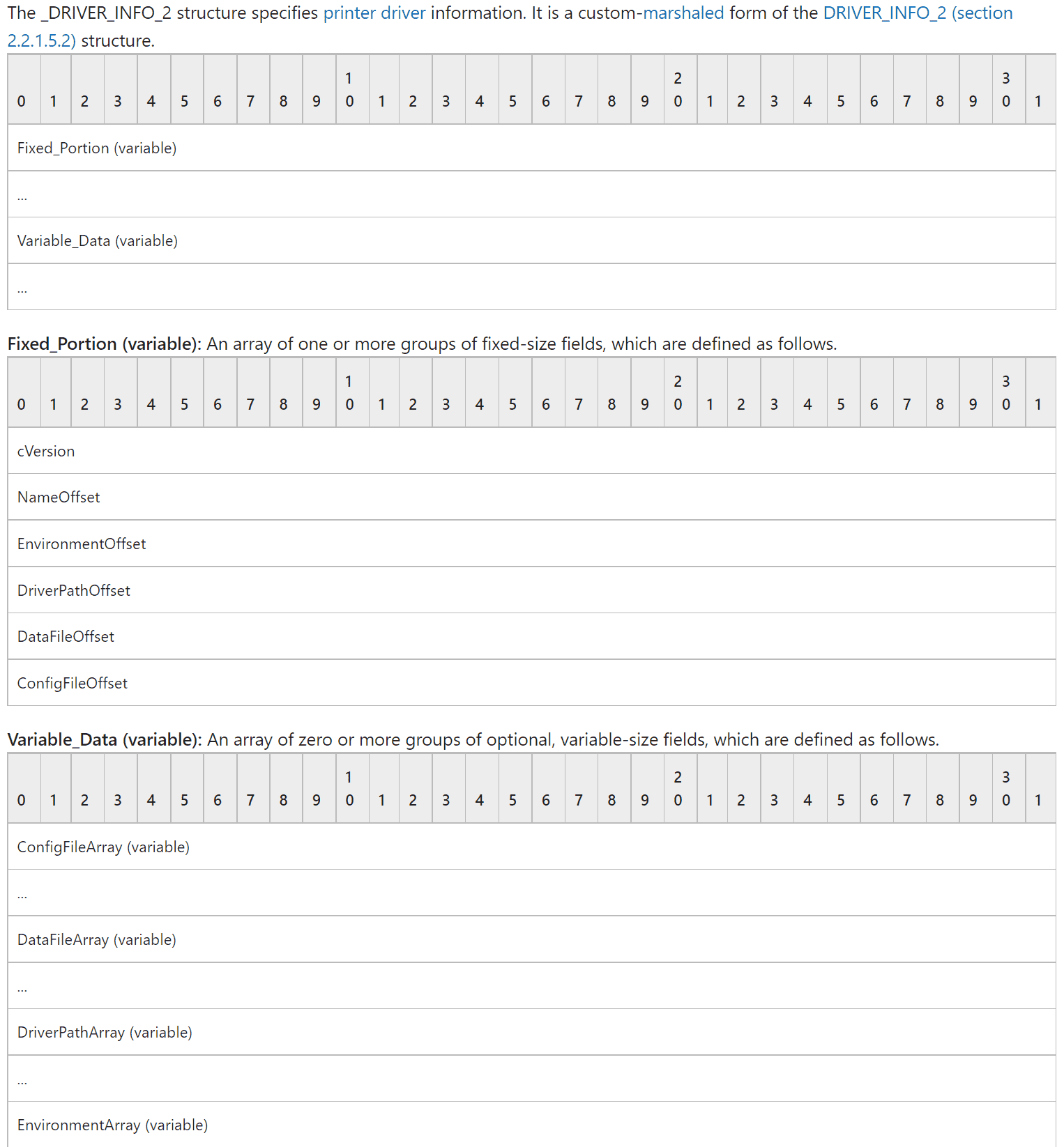 The output from resp.dump() contains our expected return structure. pcReturned tells us how many drivers are installed and pDrivers is a long array of bytes that we need to convert into a _DRIVER_INFO_2 structure. Porting this structure is tricky because it has a Fixed_Portion array and a Variable_Data array. The first array contains the offset to where the driver data can be found, while the second array defines the actual driver data, and that the data for ConfigFileArrayis between the ConfigFileOffset and the DataFileOffset.