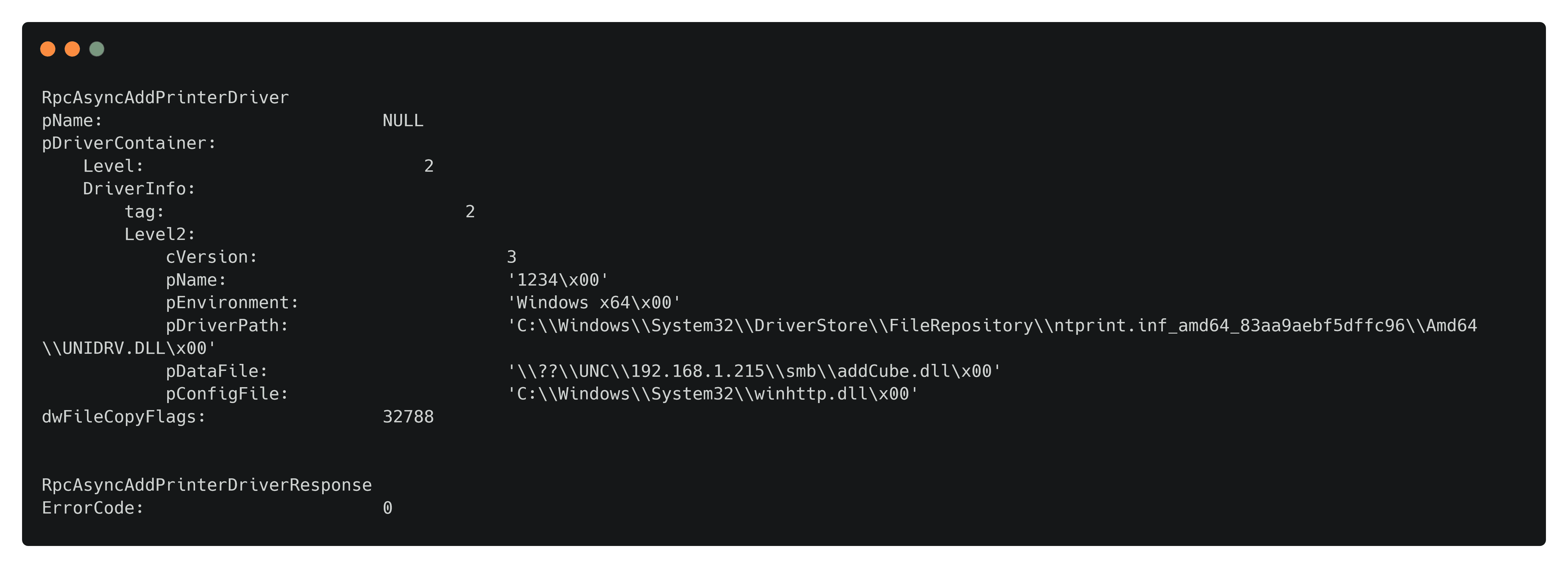 When all the Structures have been created in Impacket, we can move on in POC.cpp and see that the RpcAddPrinterDriverEx method is called next, which in MS-PAR is named RpcAsyncAddPrinterDriver.